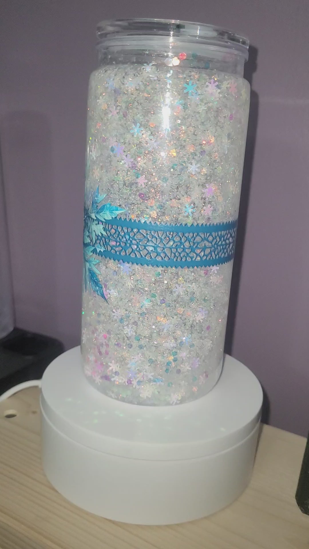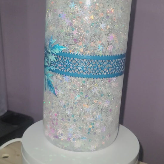 20oz Snow Globe Tumbler. White mix glitter with snowflakes. Snowflake and ribbon decal. Medium flow.