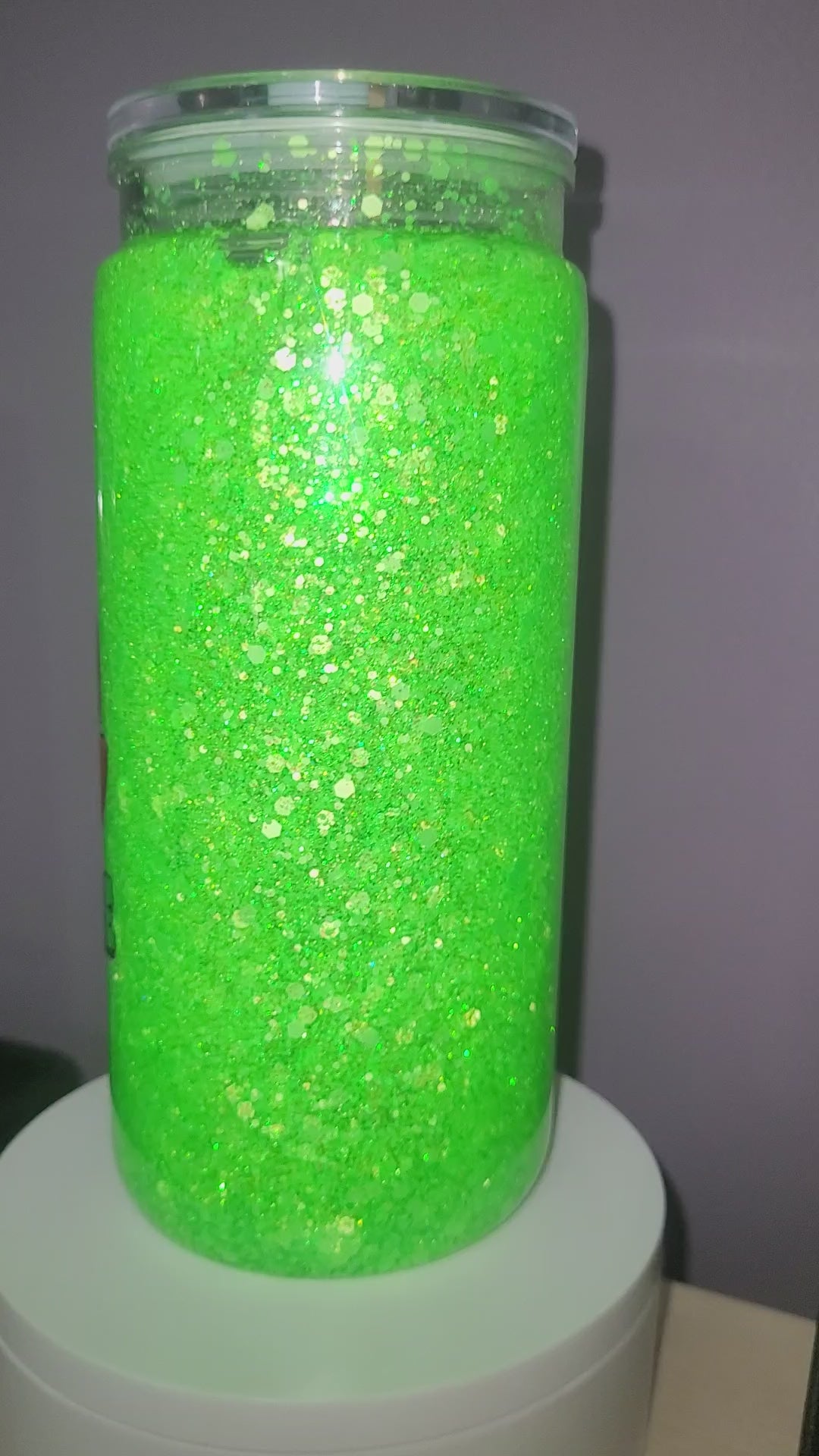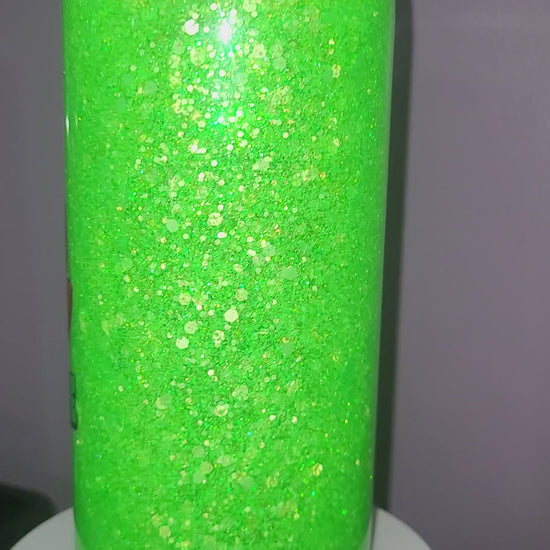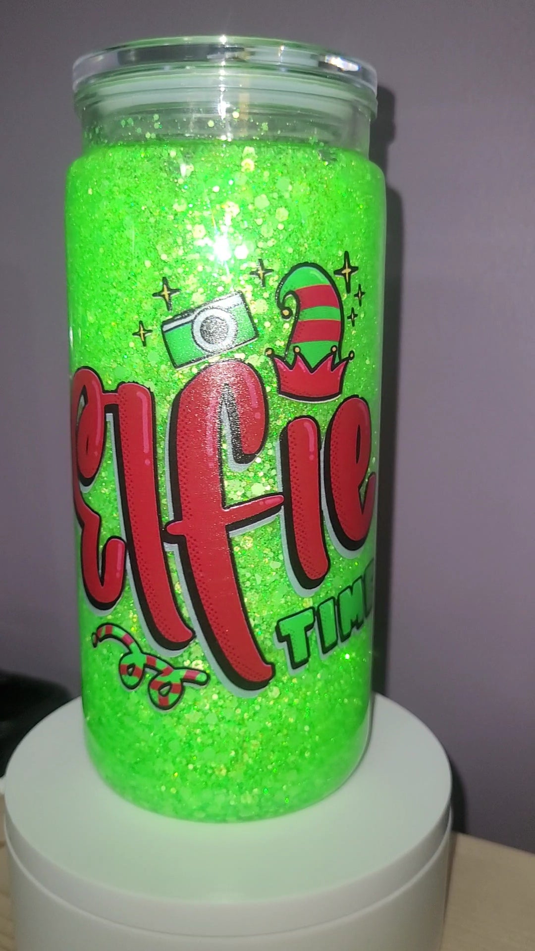 20oz Snow Globe Tumbler. Green mix glitter. Slow flow. Elfie time decal.