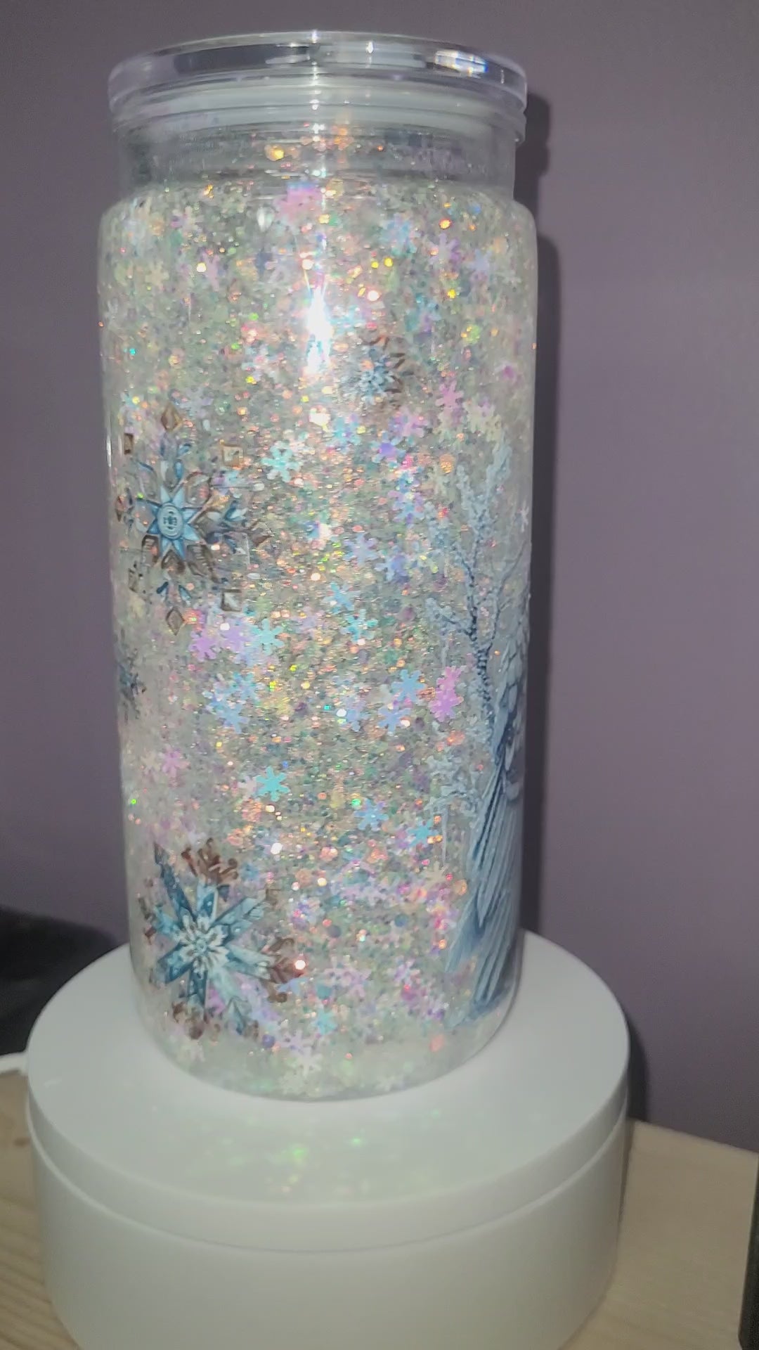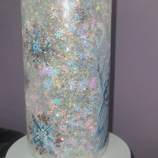 20oz Snow globe Tumbler. Owl & Snow flake decal. Snowy surprise Snow fall glitter. Fast Flow.
