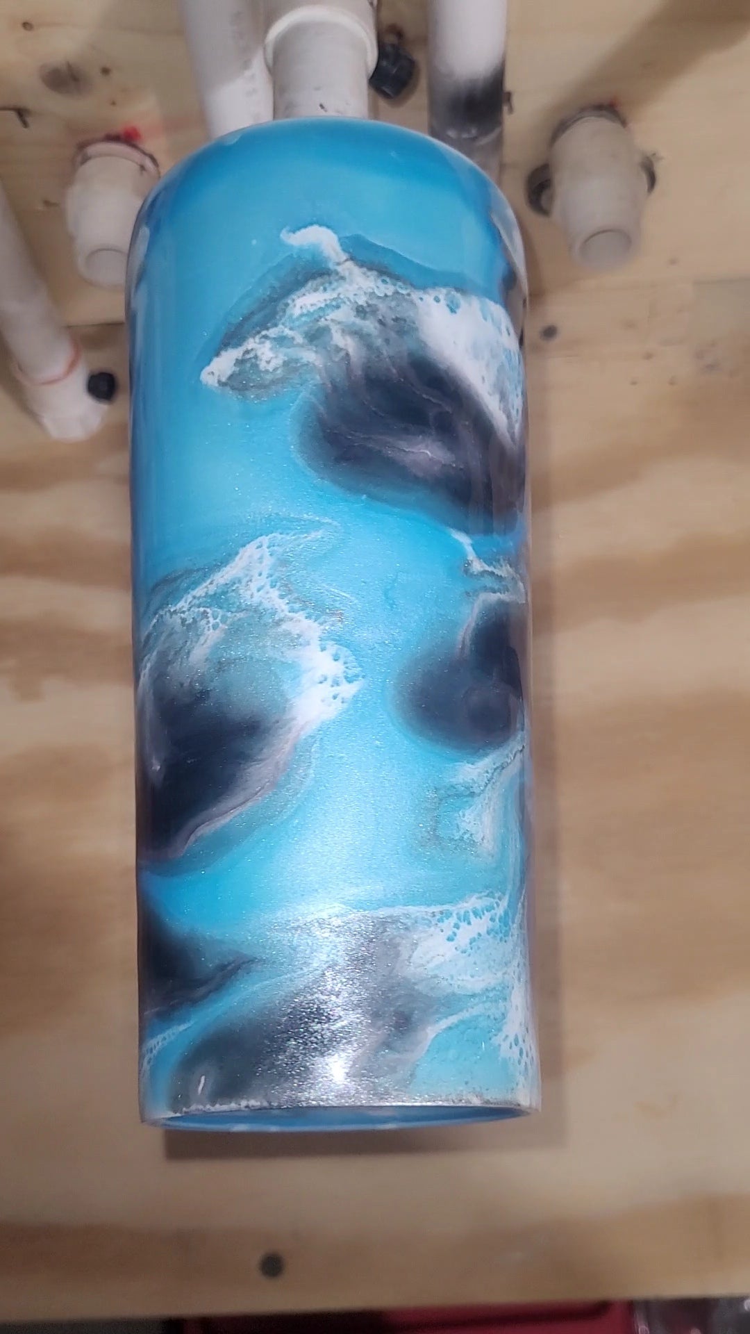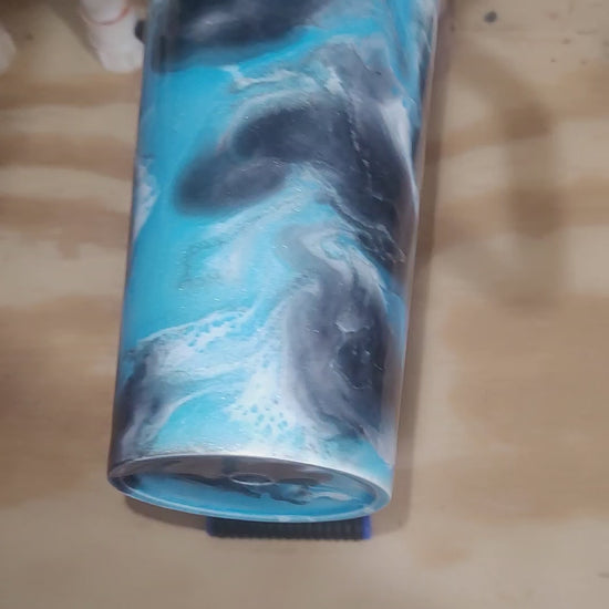 24Oz Slim Tapered Stainless Steel Tumbler. Blue Mica Base, Silver Black, White Suspension Ink Swirl.