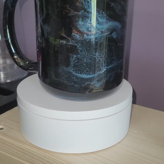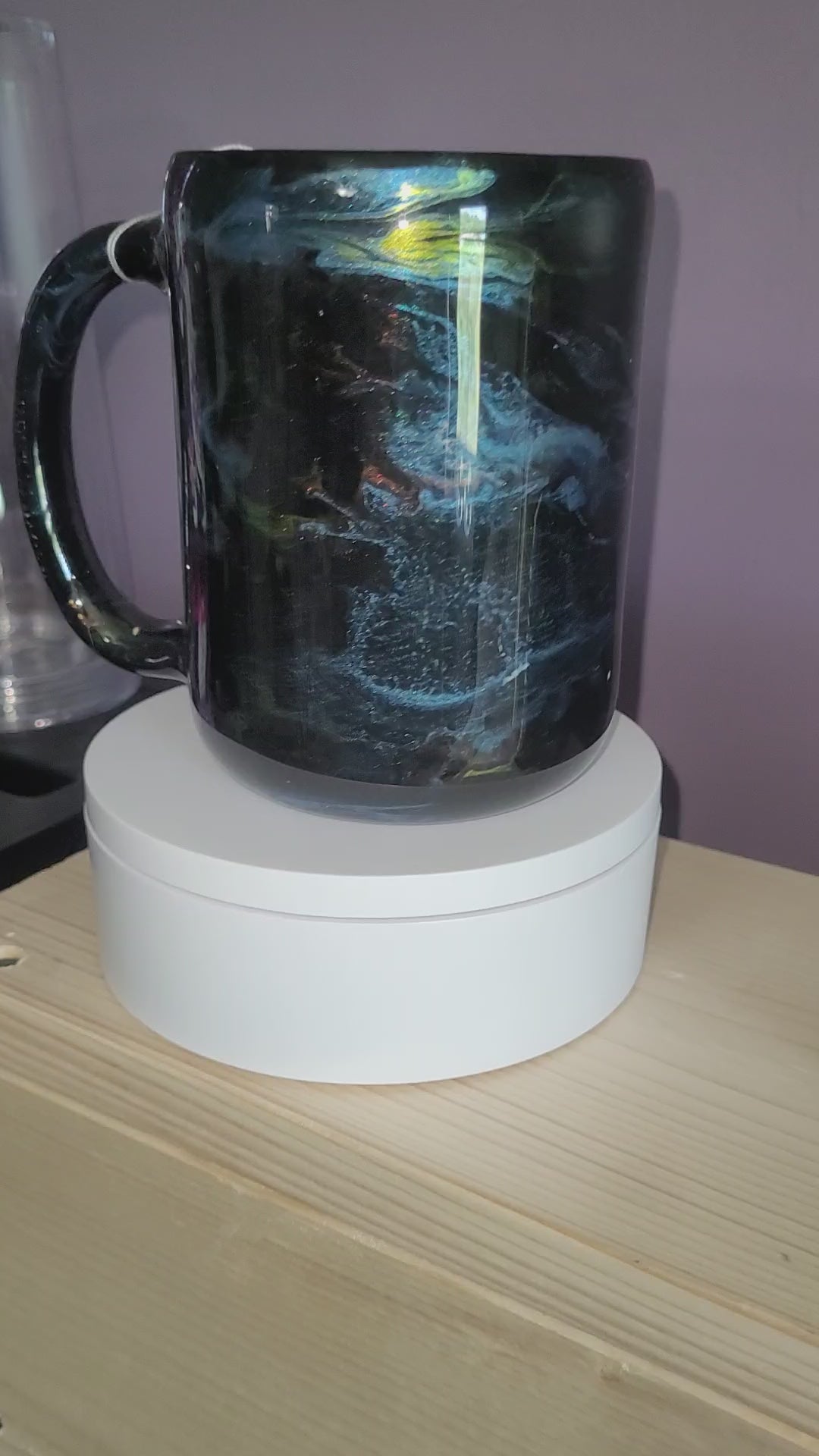 15oz ceramic coffee mug. Black base with mica ink swirl
