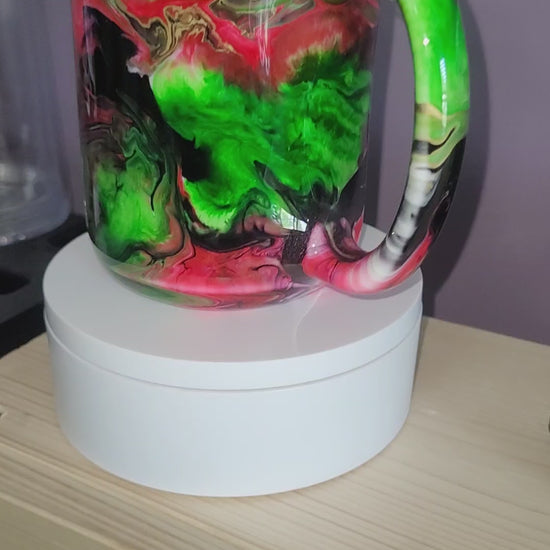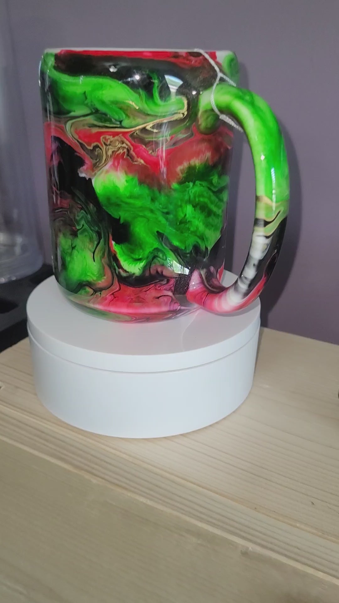 15oz Ceramic coffee mug. Red, green, black, gold swirl