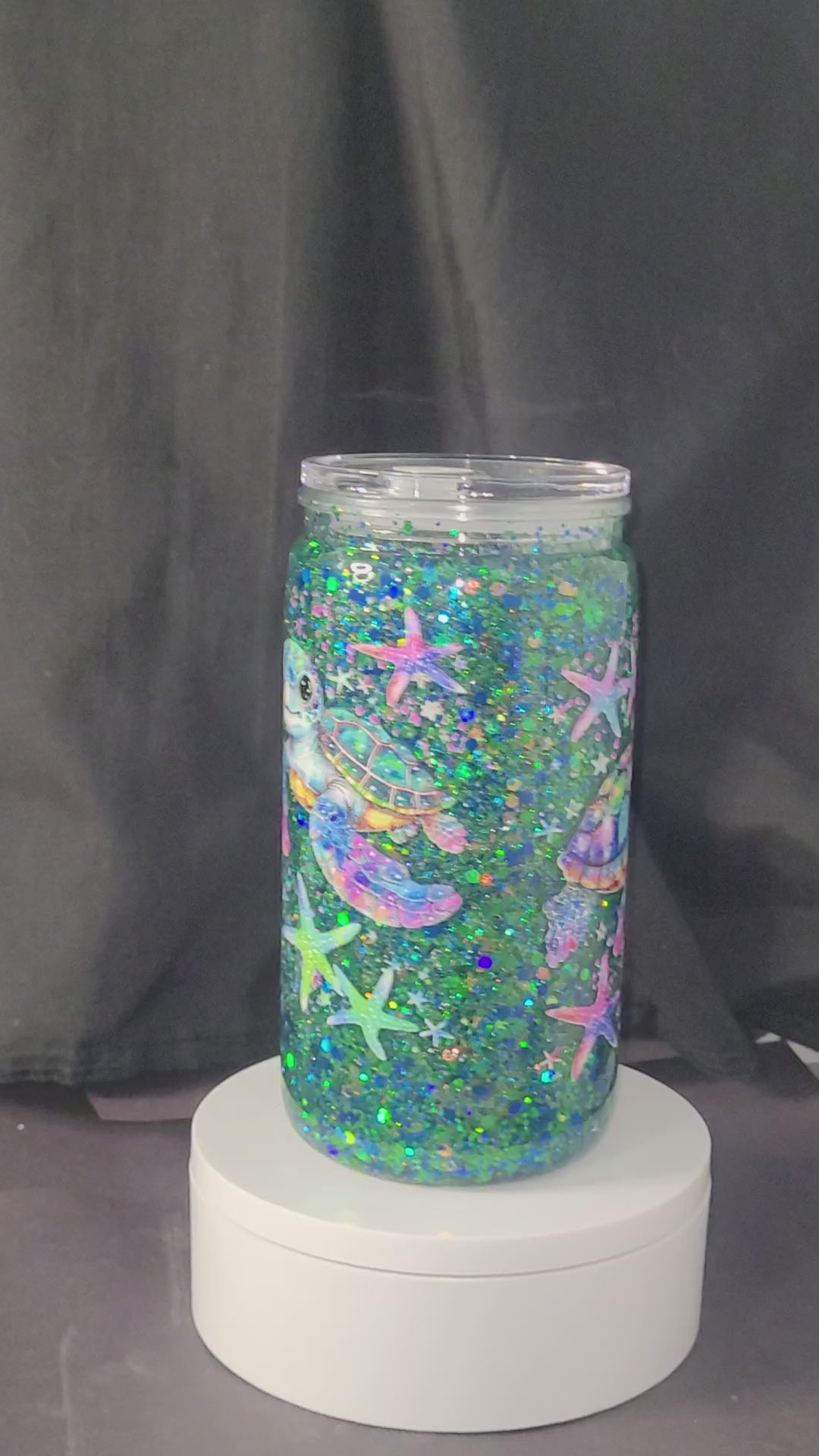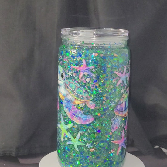 16oz Acrylic snow globe tumbler, Green Ocean Mix Turtle & Stars