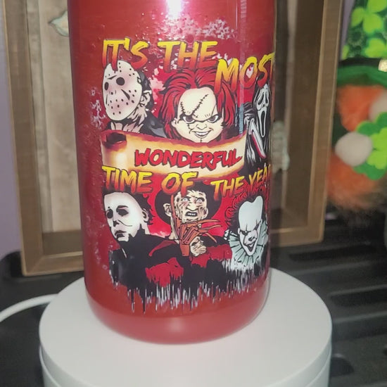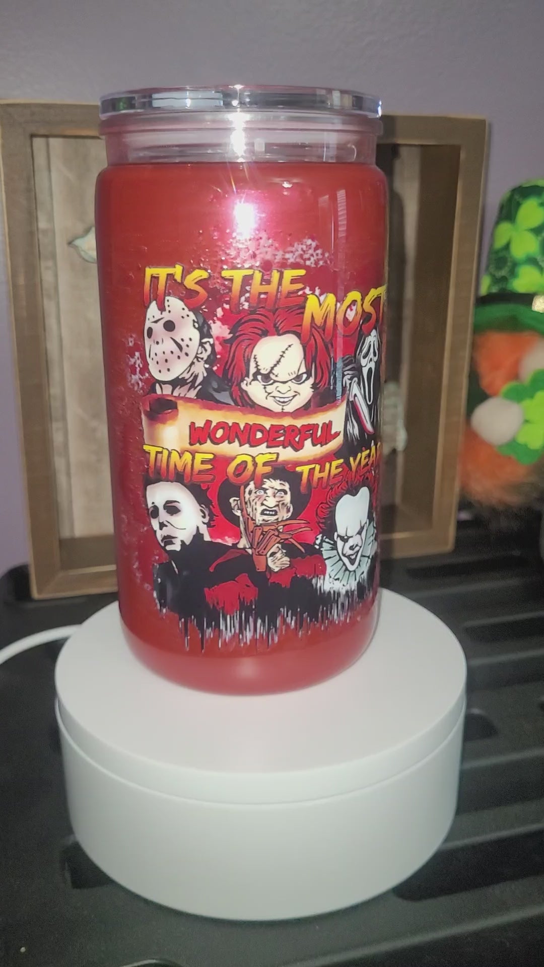 16oz Snow Globe Tumbler Red Mica with Horror theme decal.