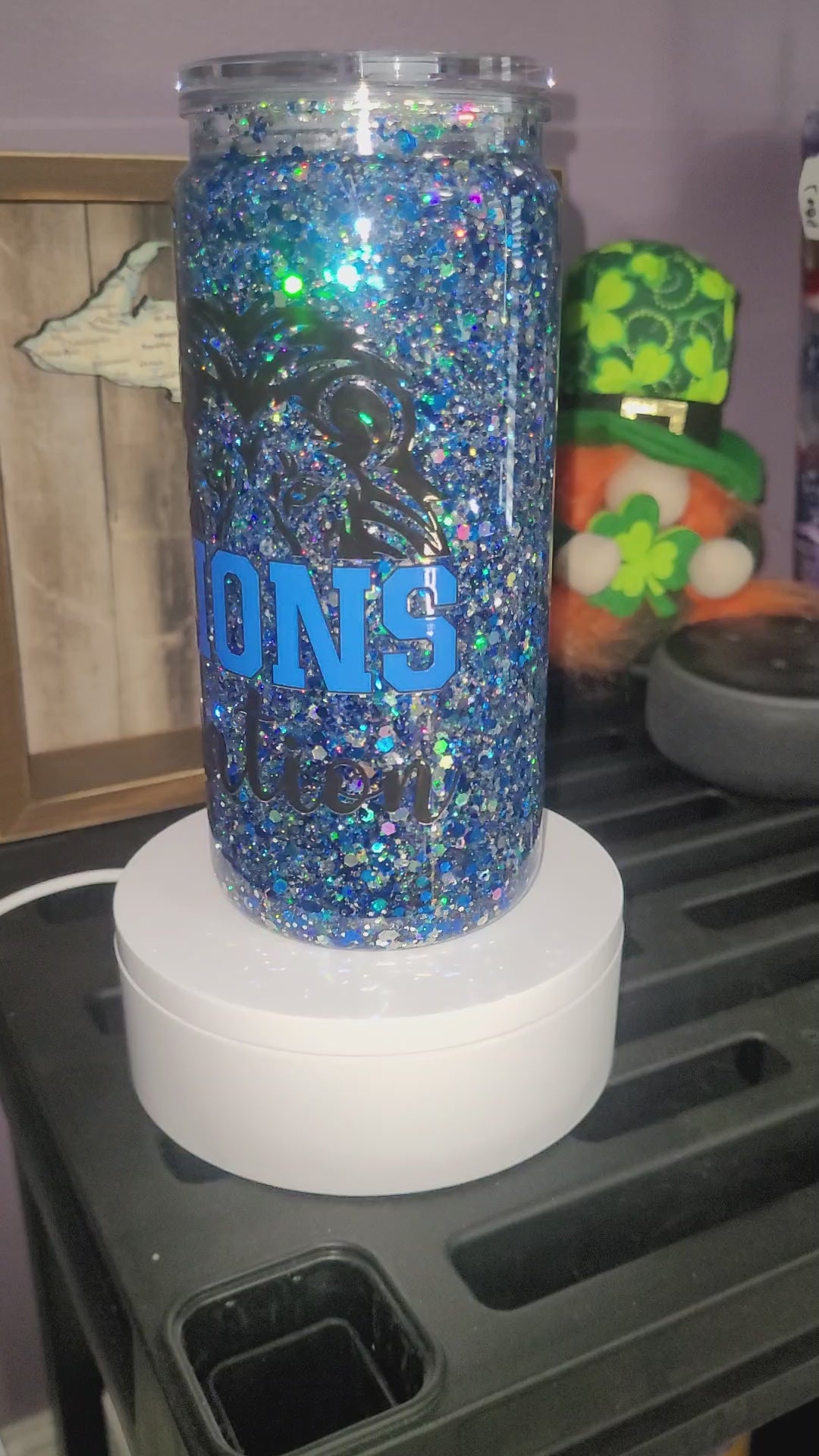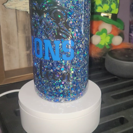 20oz Snow Globe Tumbler. Blue & Silver glitter mix. Fast Flow. Lions Nation Decal