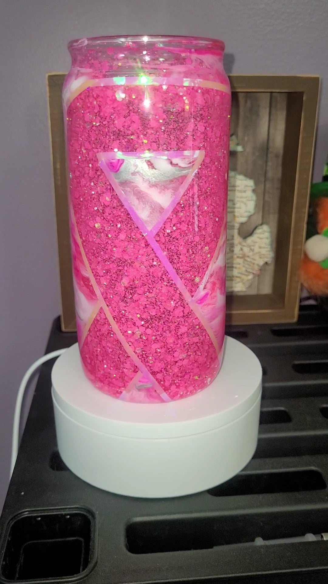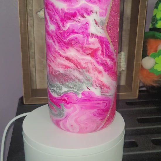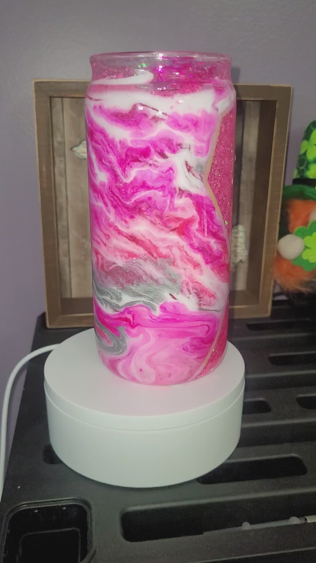 20oz Snow Globe Tumbler. 3 Pink Glitter Mix. Fast Flow. Pink & Silver ink swirl. Peekaboo Style Ribbon.
