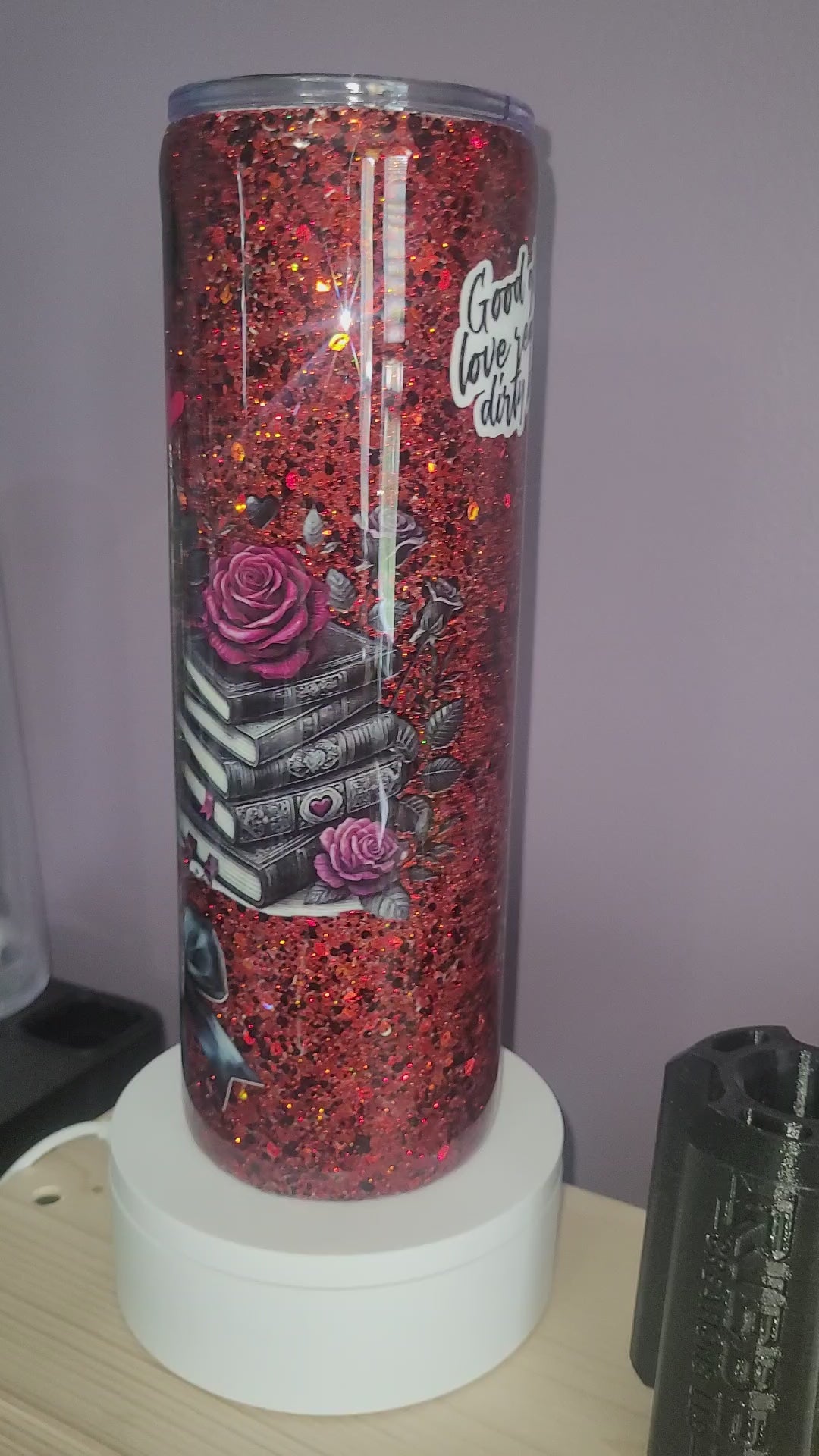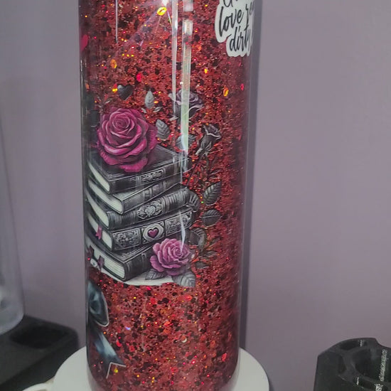30oz Skinny Stainless Steel Tumbler. Red, Black & Lip Glitter Base. With book reference decals.