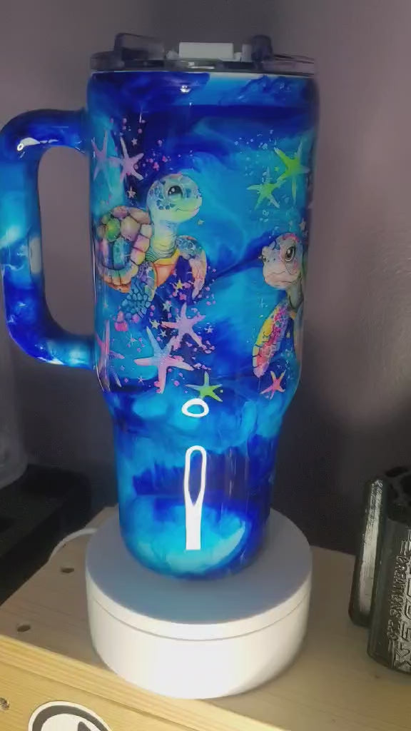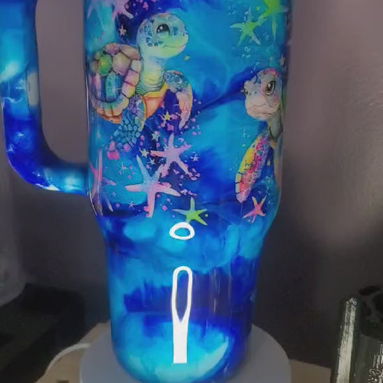 40oz Big Swig Stainless steel. Ink Swirl 4 diff blues with turtle decal. Glows in the dark