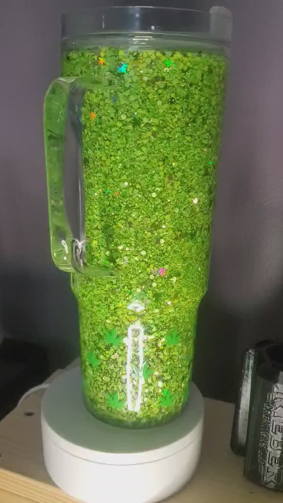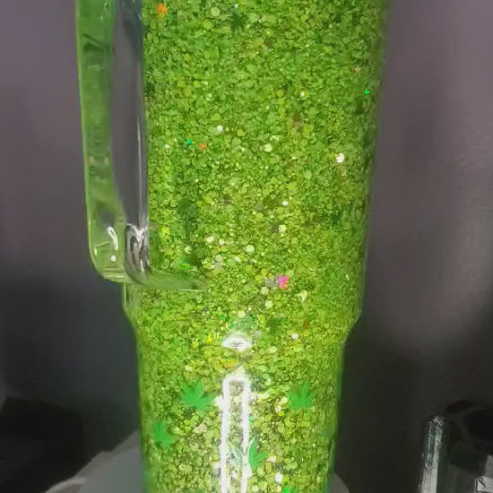 40oz Snow Globe, green gold mix glitter. Medium flow. Stir the pot decal and leaves